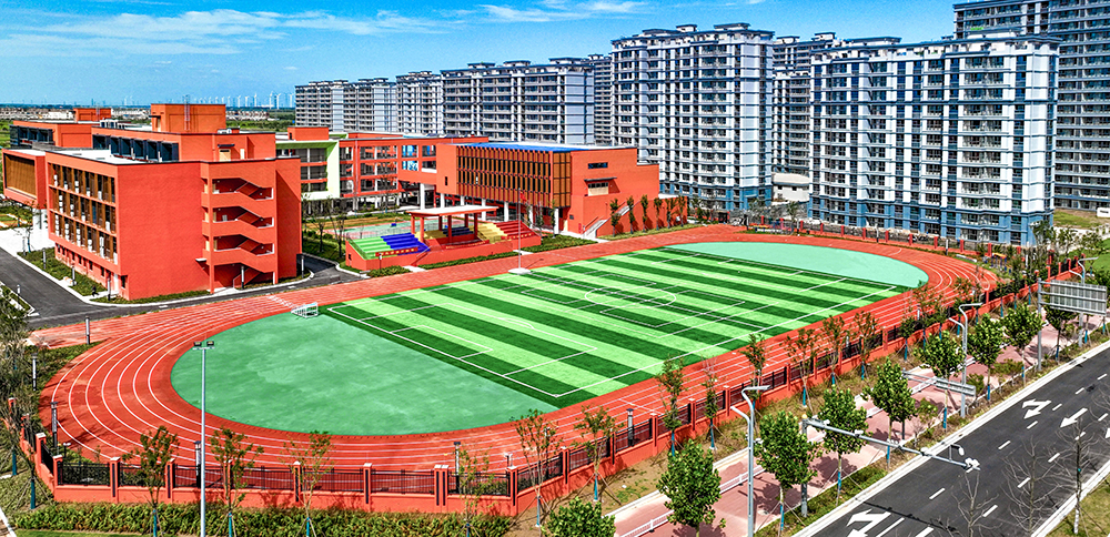位于港城安置區(qū)一期B區(qū)南側(cè),占地面積46.5畝,建筑面積約2.2萬平方米,總投資約1.5億元。建設(shè)規(guī)模滿足36個班級1620人的辦學(xué)需求。項目總體布局采用院落式布局,包含教學(xué)樓、綜合樓、風(fēng)雨操場、門衛(wèi)、看臺五個單位工程。校園建筑整體為哈弗紅現(xiàn)代風(fēng)格、局部點綴彩色形體,增添活躍元素。
